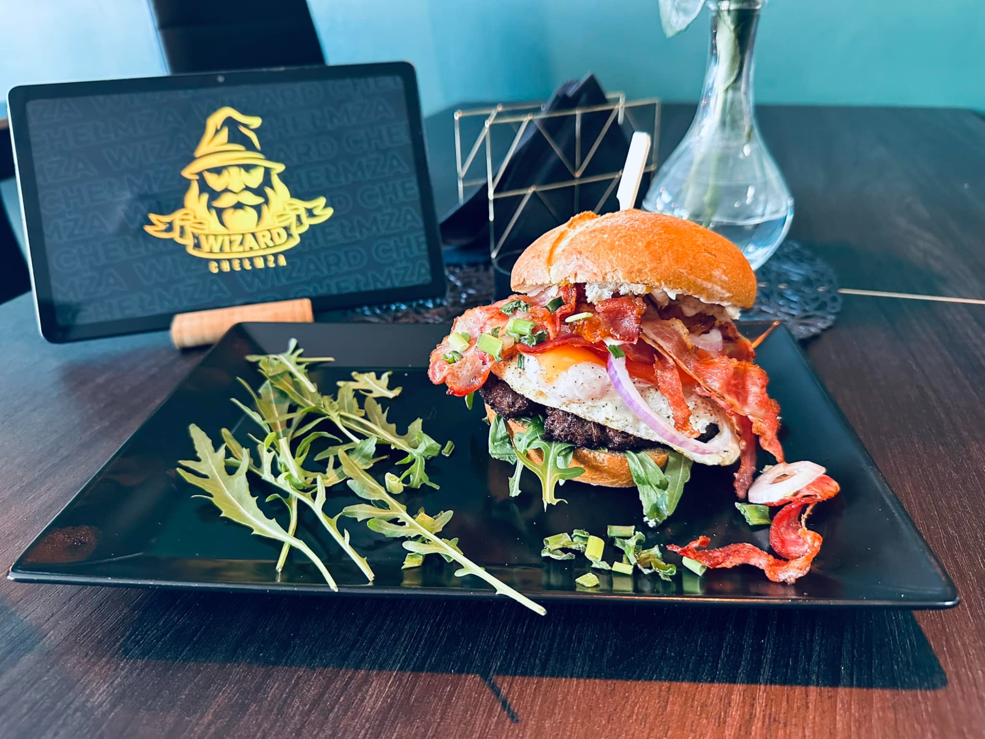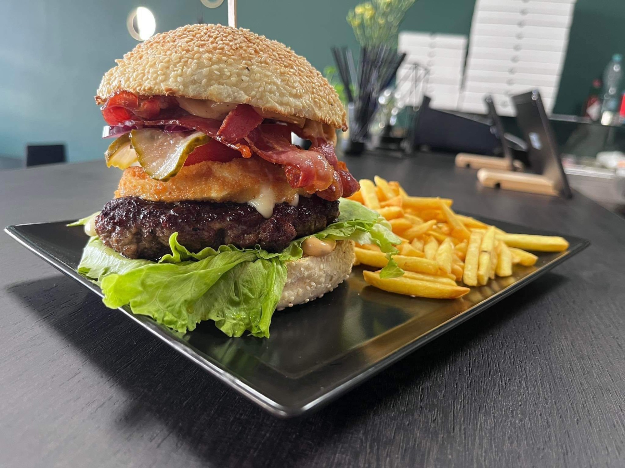 Filet 120g, bekon, sałata lodowa, ogórek kanapkowy, pomidor, cebula czerwona, ser, sos chicker -