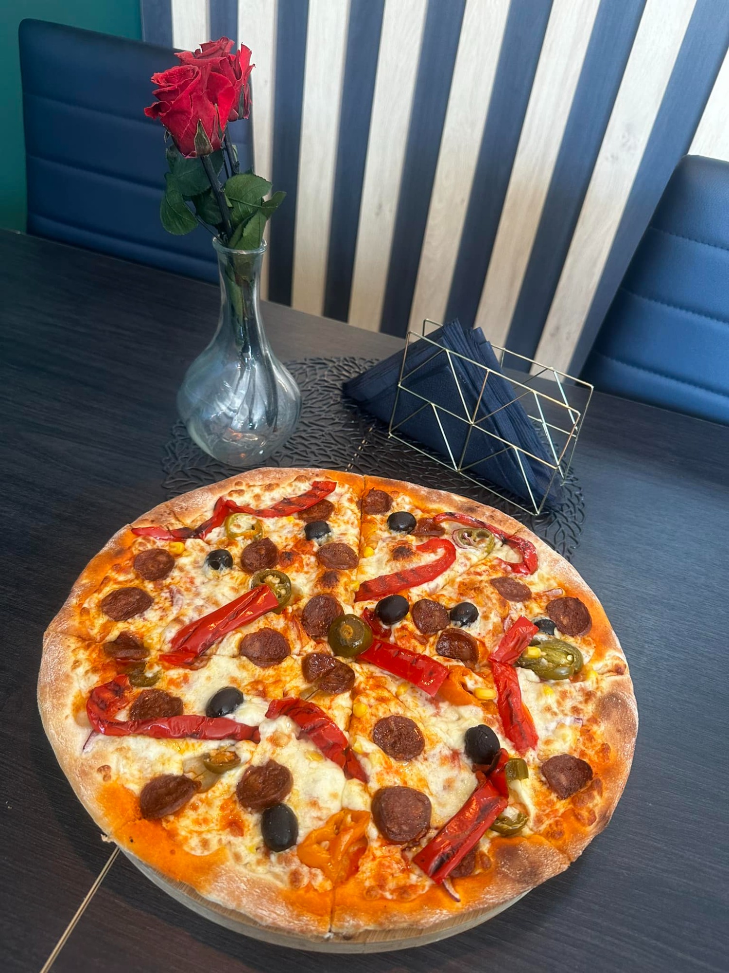 sos pomidorowy, ser, pieczarki, salami, papryka, ogórek konserwowy, cebula, tabasco, mieso kebab wołowina , jalapeno -